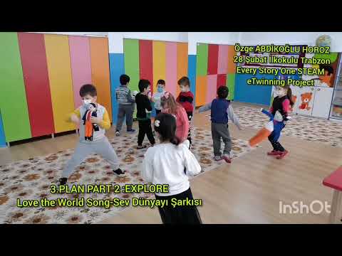 3. plan keşfetme aşamasında sev dünyayı şarkısında öğrencilerim proje maskotları ile dans ediyor.